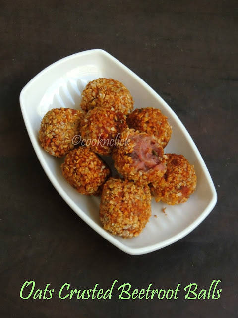 Anything as deepfried are my kid's favourite especially for my younger one, coz he loves to have deep fried foods for his snacks. Since i dont like deep frying,i'll go for bakes.But sometimes i'll change my mind and make some deep fried foods just to see the smile on his face. If its deep fried, he can have anything, obviously i'll like to add veggies in most of the deep fried foods. One among of those deep fried trials,today's vegetable loaded oats crusted beetroot balls came out extremely fabulous. These balls goes for this week's blogging marathon as am running with one bite appetizer as theme.